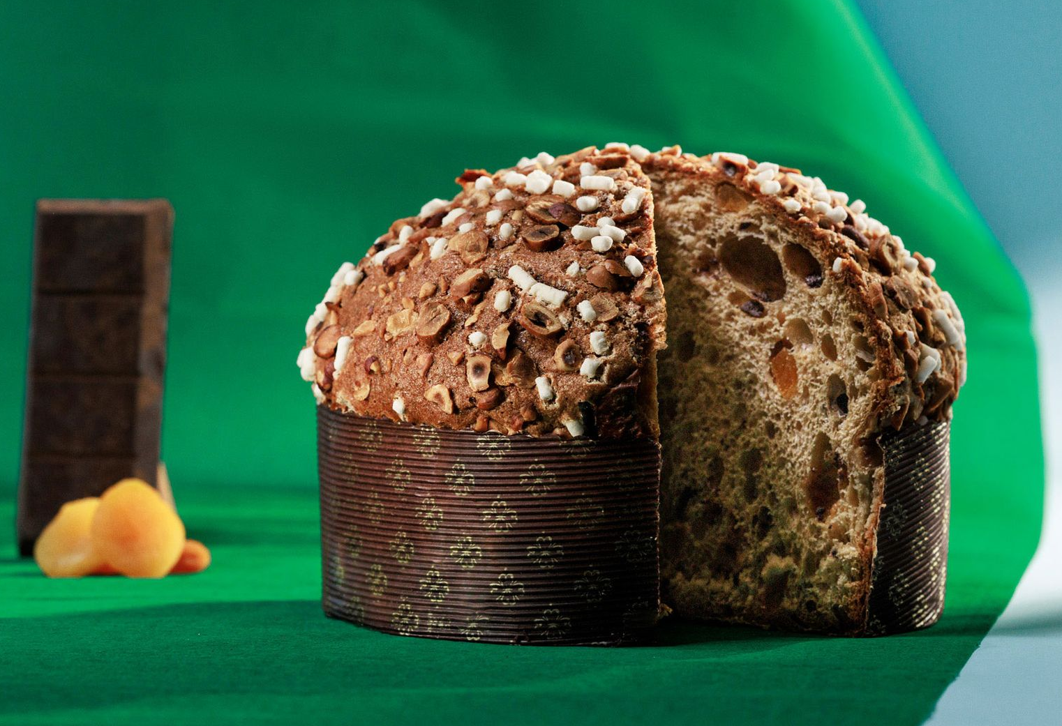 Panettone con Canditi d'albicocca e “Cioccolato di Modica IGP”, ricoperto di glassa e fogliame di nocciole.