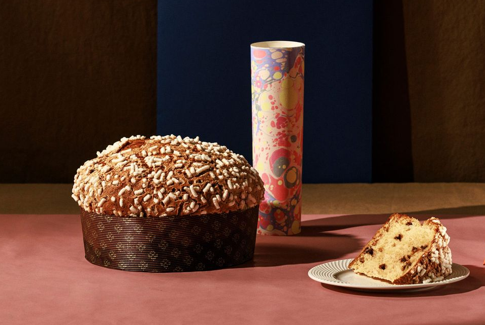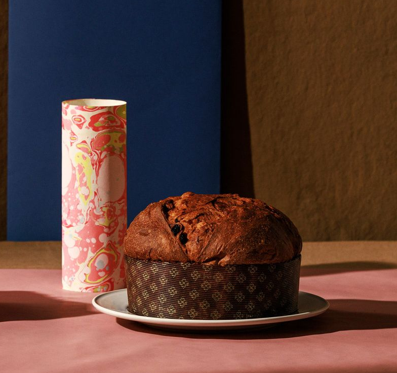 Panettone con Essenza di petali di rose, gocce di cioccolato rosa, confettura di fico d'india, cioccolato bianco e croccantini di cioccolato.