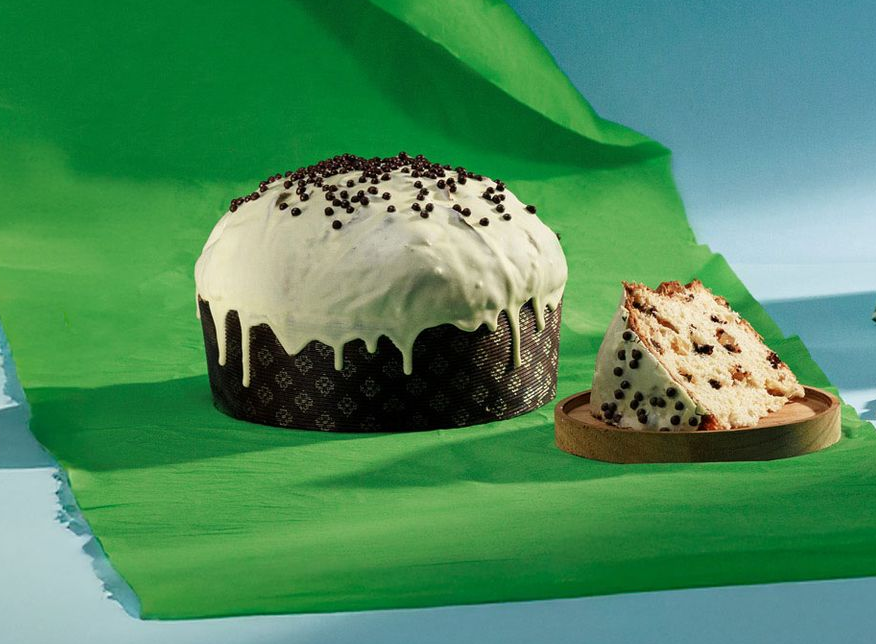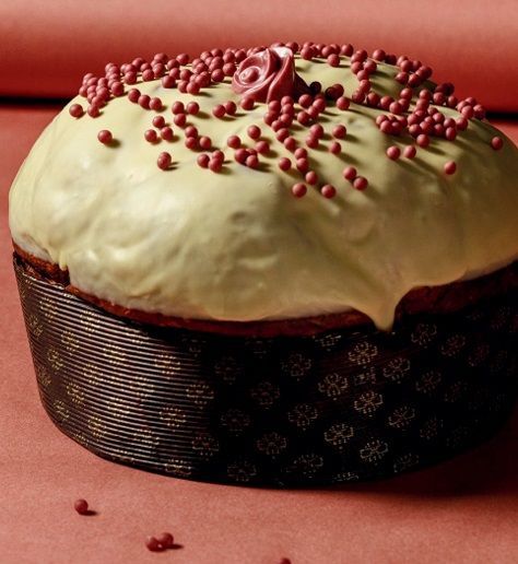 Panettone con frutti di bosco semi-canditi ricoperto di cioccolato bianco e croccantini di cioccolato.
